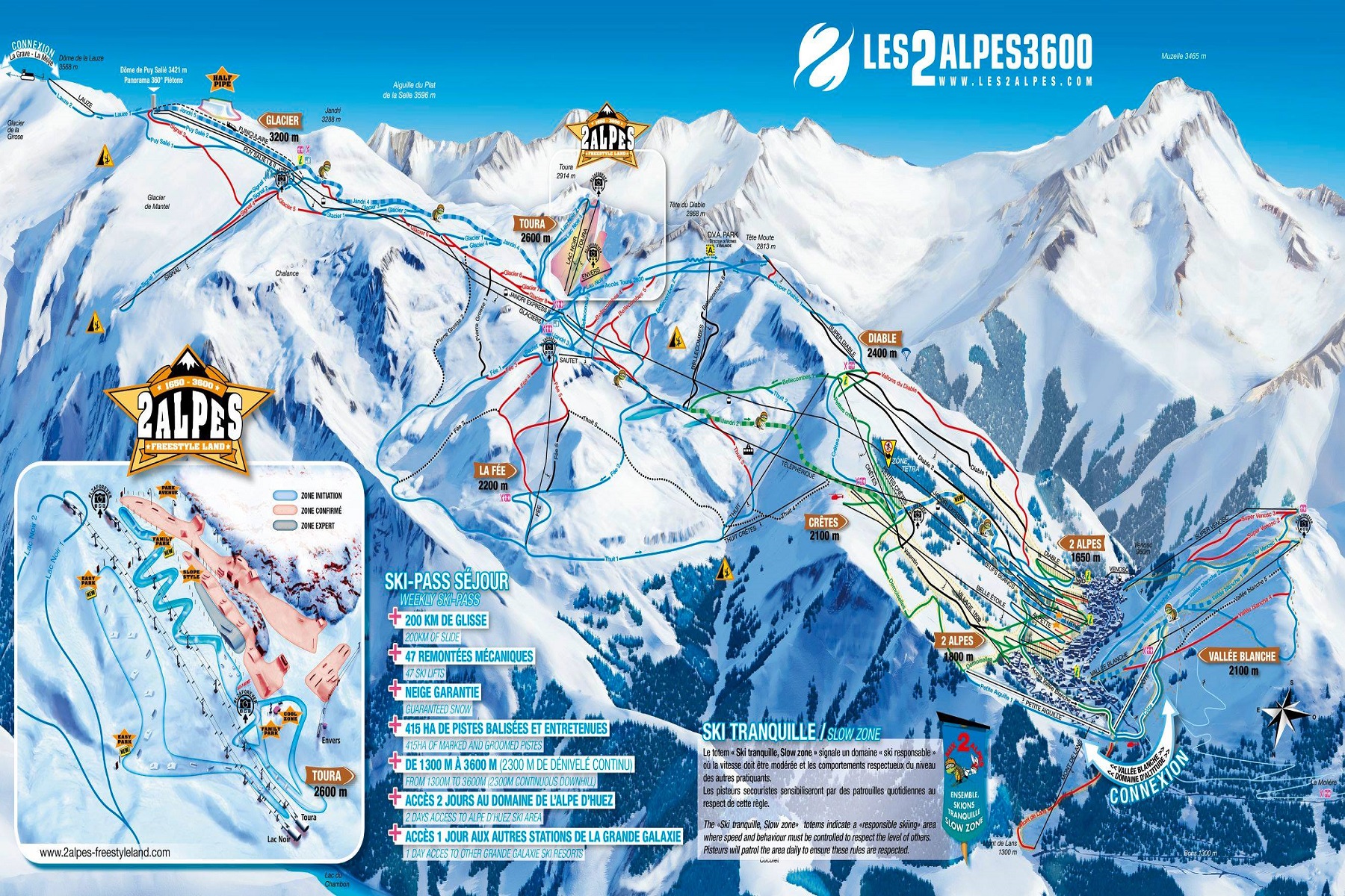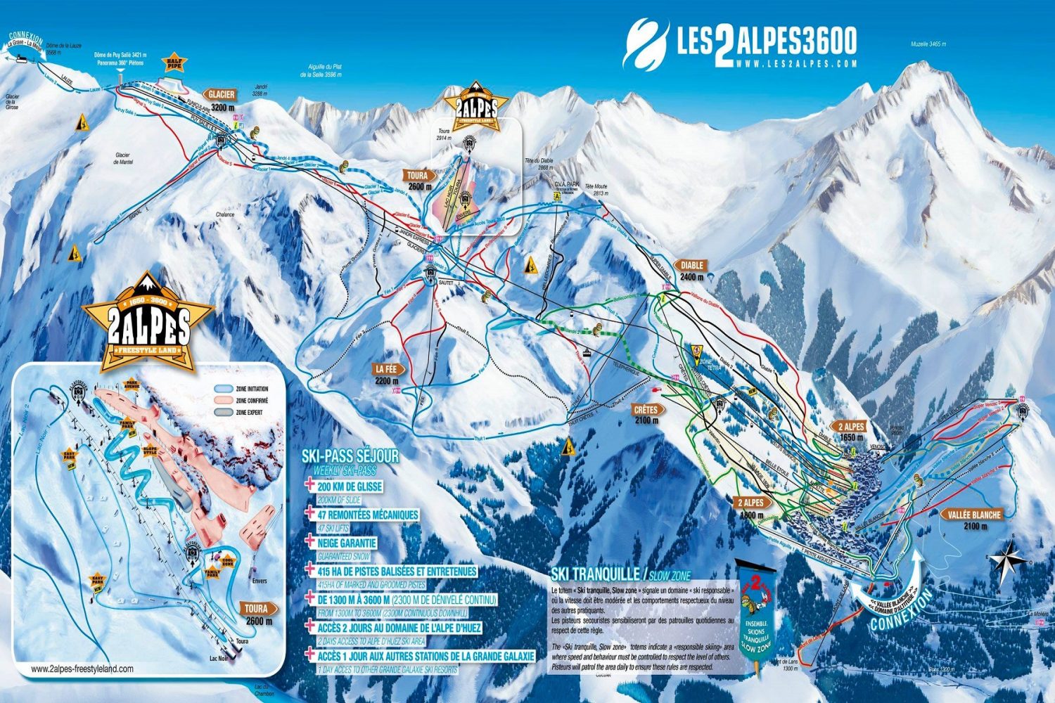 Skijalište Les 2 Alpes 100%-tna je snježna garancija. Na nadmorskoj visini od 1650-3560 m nalazi se ukupno 220 km povezanih staza (44 km crnih, 78 km crvenih, 78 km plavih), ukupno 3 gondole, 3 kabinske žičare, 25 sjedežnica, 20 vučnica, 1 planinski vlak, veliki snowpark. Gradić nudi puno shopping mogućnosti, restorana, barova i diskoteka. U cijenu ski karte Grand Galaxie uključeno: 2 dana skijanja na skijalištu Alpe d’Huez, 1 dan skijanja u Serre Chevalier, Montgenevre i Sestriere, klizalište i javni vanjski grijani bazen.